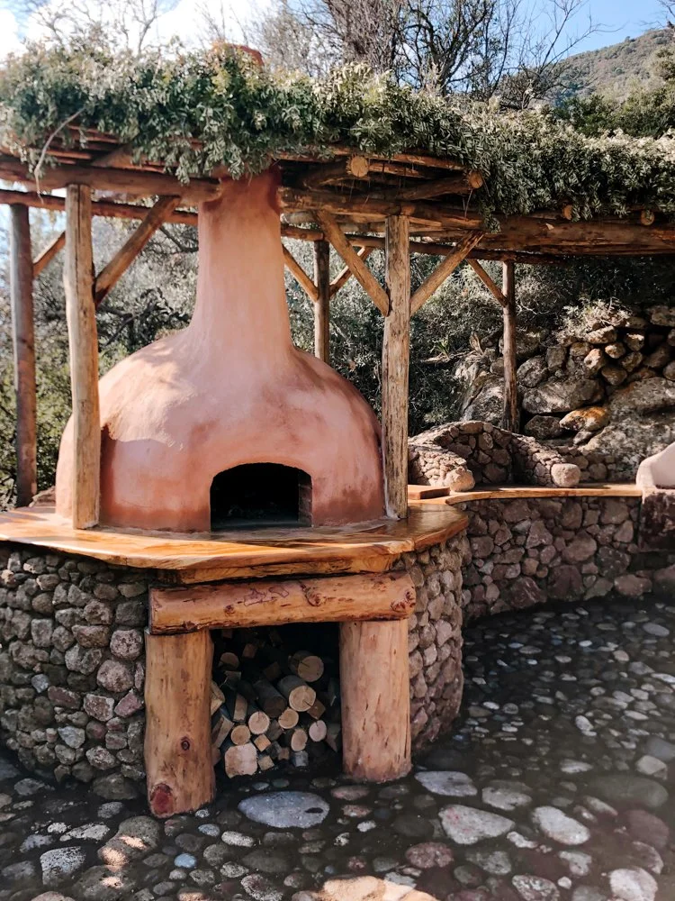 The oven, finished in traditional tadelakt with a pigment unique to Panarea, brings both beauty and authenticity. Surrounded by aromatic plants and native trees, the entire setting blends seamlessly into the natural landscape.